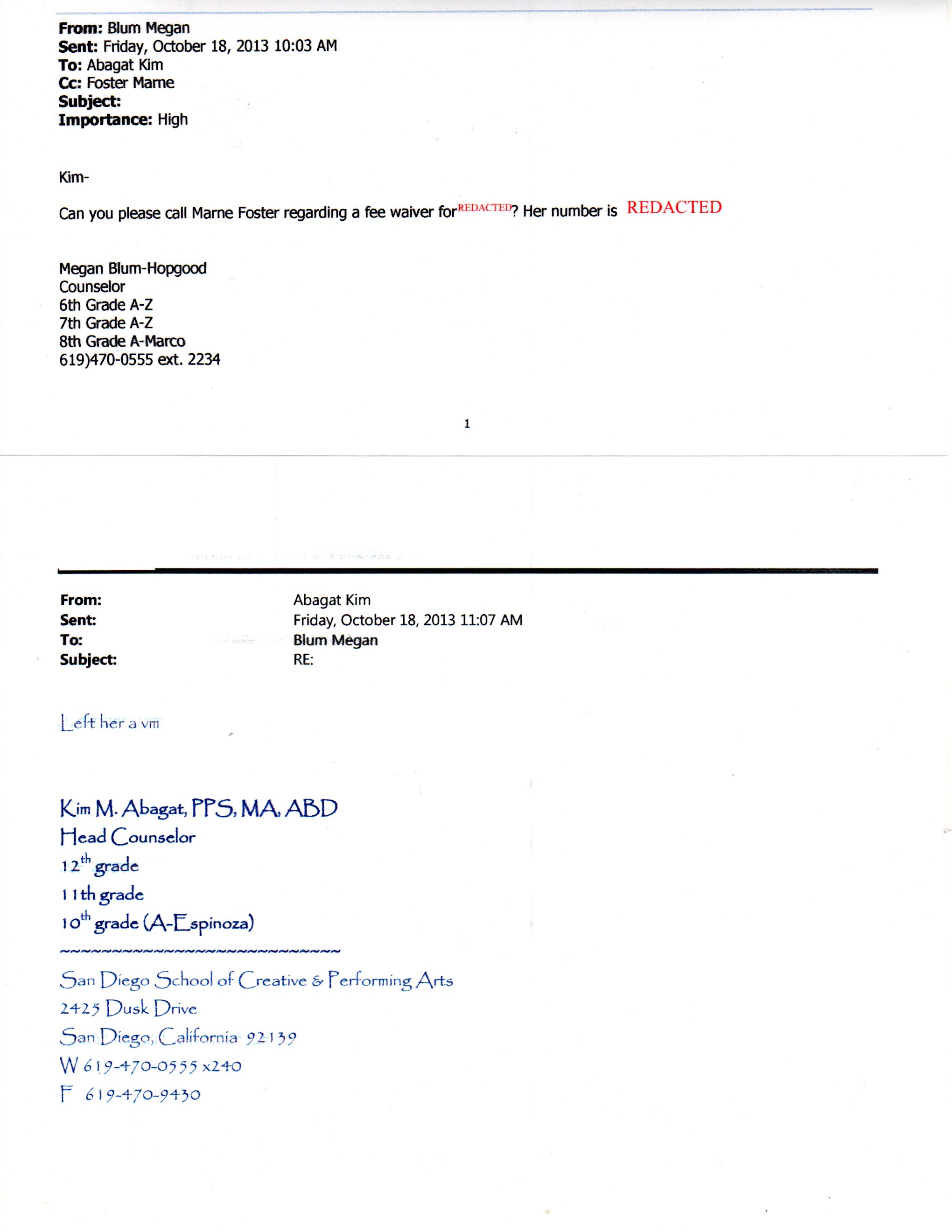 Through a public records request, District Deeds found that former SCPA Middle School Counselor Megan Blum, the same SCPA Counselor that improperly provided the sealed Common Application to Foster, had to request an SAT/ACT fee waiver from Head High School Counselor Kim Abagat below: