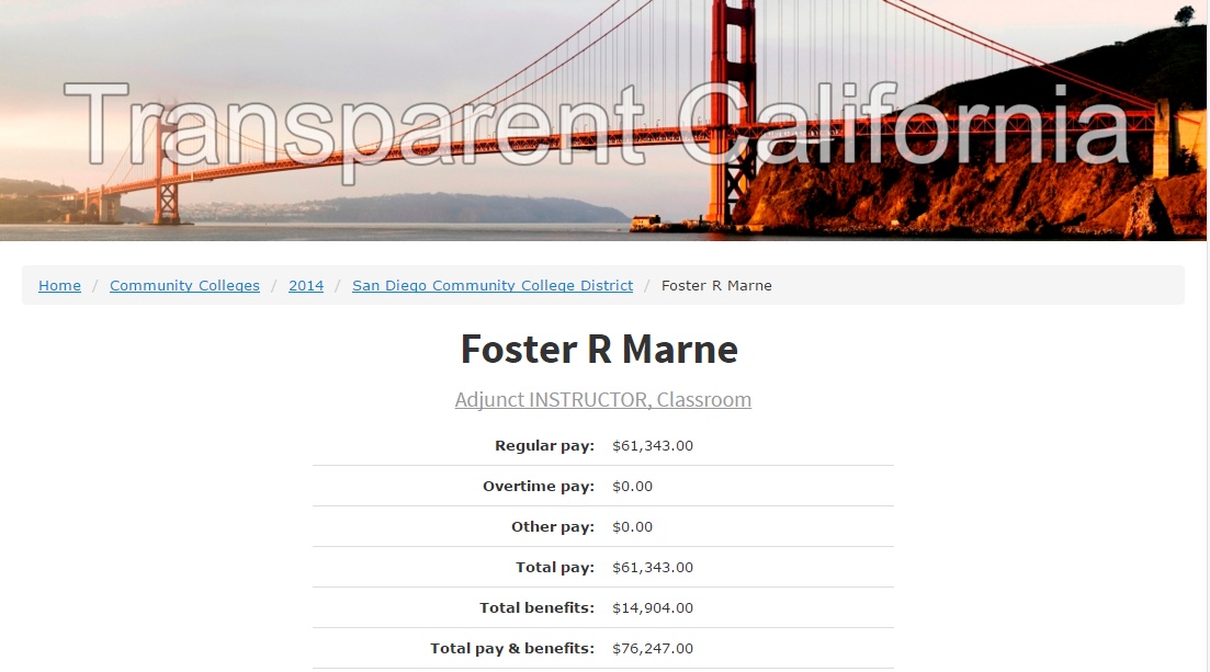 Transparent California shows Foster made $76,247 in salary and benefits as an instructor in 2014 – within 3-5% of her 2013 Salary:
