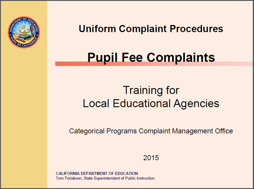 Anonymous complaints may be submitted to the school district and if supporting documents and information are provided the complainant must receive a district response within 60 days. An appeal can be filed, within 15 days, to the California Department of Education. For more information check out this Training document by the California Department of Education’s Kerry Ruzicka titled Uniform Complaint Procedures – Pupil Fee Complaints .