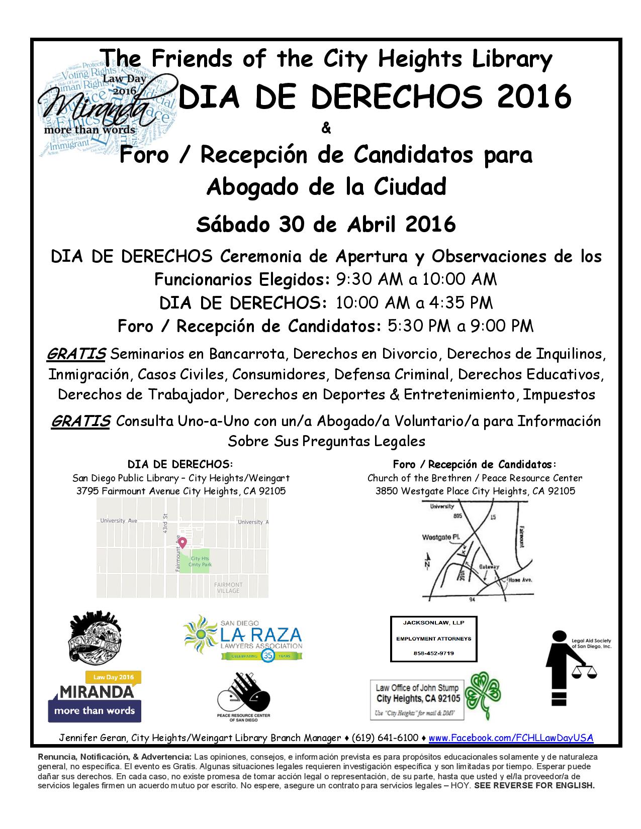 The Friends of the Library and several other community organizations will be hosting “Law Day 2016” Saturday, April 30th, 2016 from 9:30 am to 4:30 pm at the City Heights Weingart Library, 3795 Fairmount Avenue!