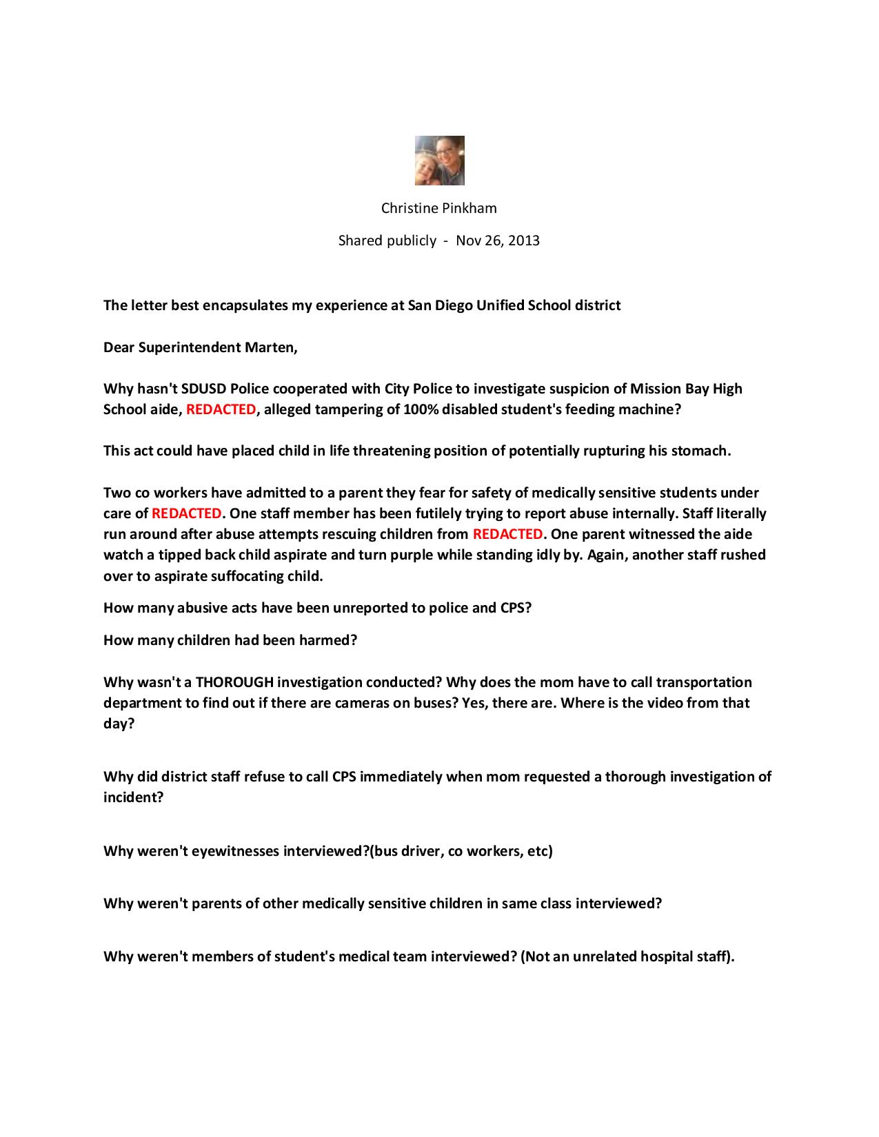 After the investigation was dropped by SDPD and buried by Cindy Marten and the SDUSD, Ms. Neufeld-Fernandez confronted Supt. Marten directly with the facts in the following letter: