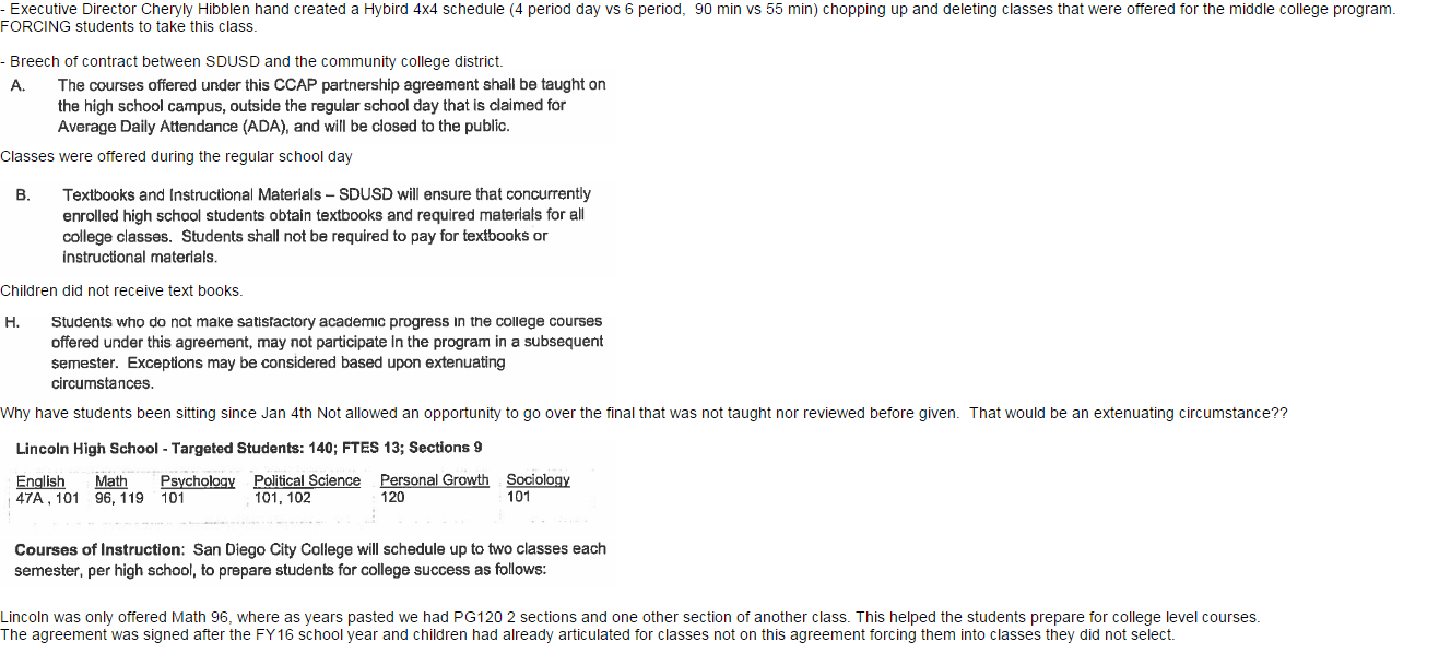 Obviously, despite the Marten and Hibbeln assurances,  no “resources are in place” and no one was watching or monitoring the class in the District office to be sure the Middle College Program was handled correctly and that all terms of the agreement with the San Diego Community College District (SDCCD) were being enforced.