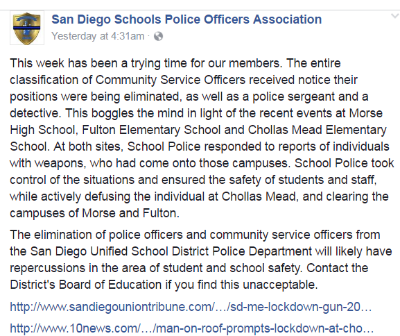 The insightful comments by Honest Admin are echoed by both the San Diego Schools Police Officers Association and the Administrators Association San Diego City Schools (AASD) describing the elimination of Student safety resources at school sites: