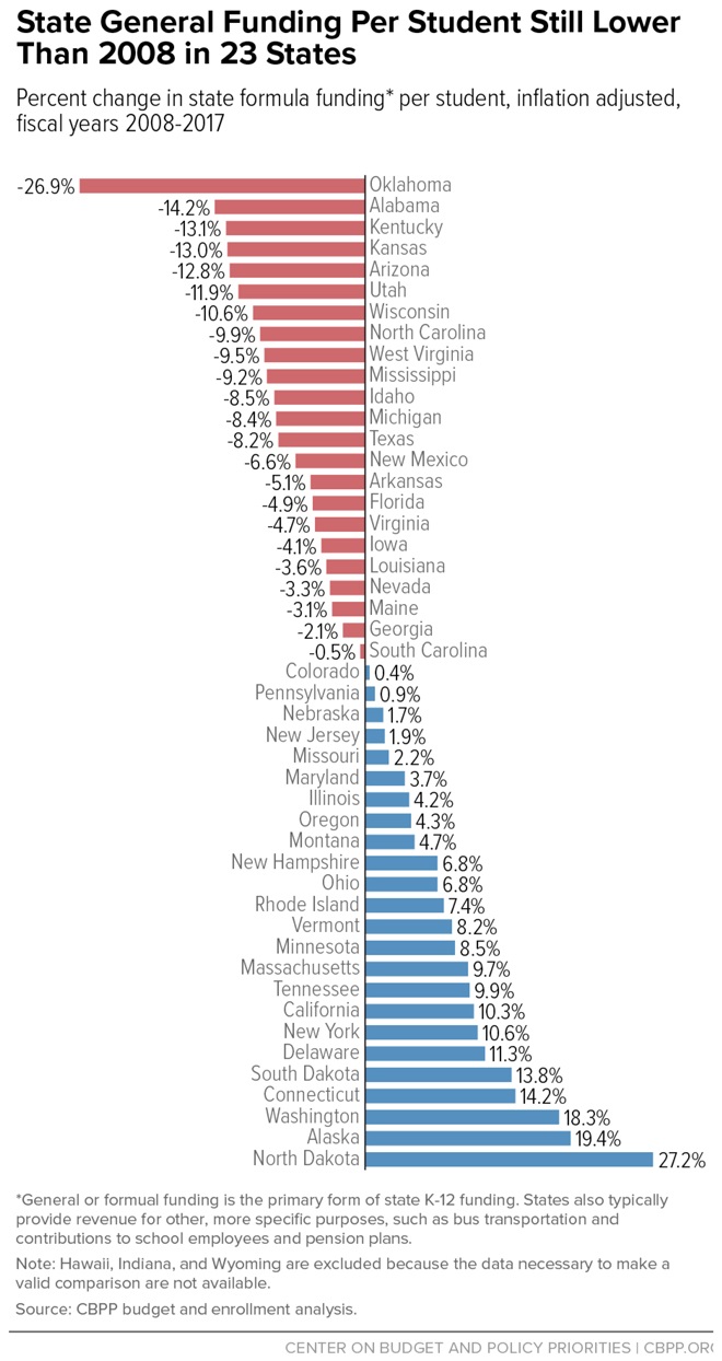This article describes how many States have not restored funding for schools since the recession in 2008. Oklahoma is used as an example where, as you can see from the graphic, schools have lost over 26% (inflation adjusted) from educational funding. The impact of that neglect has “cut into the student experience via larger classes, reduced bus transportation and a shorter school year”.