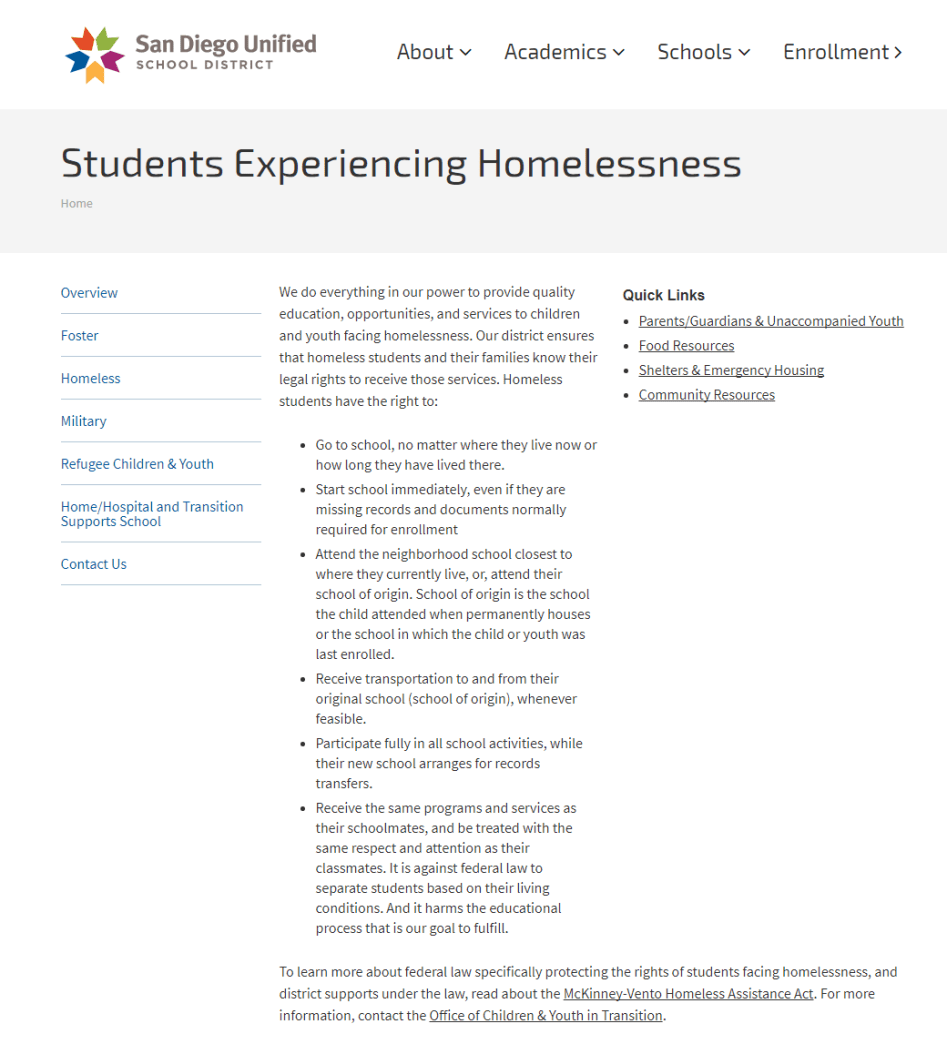 Here is the page for the support of homeless students from the San Diego Unified School District (SDUSD) website: