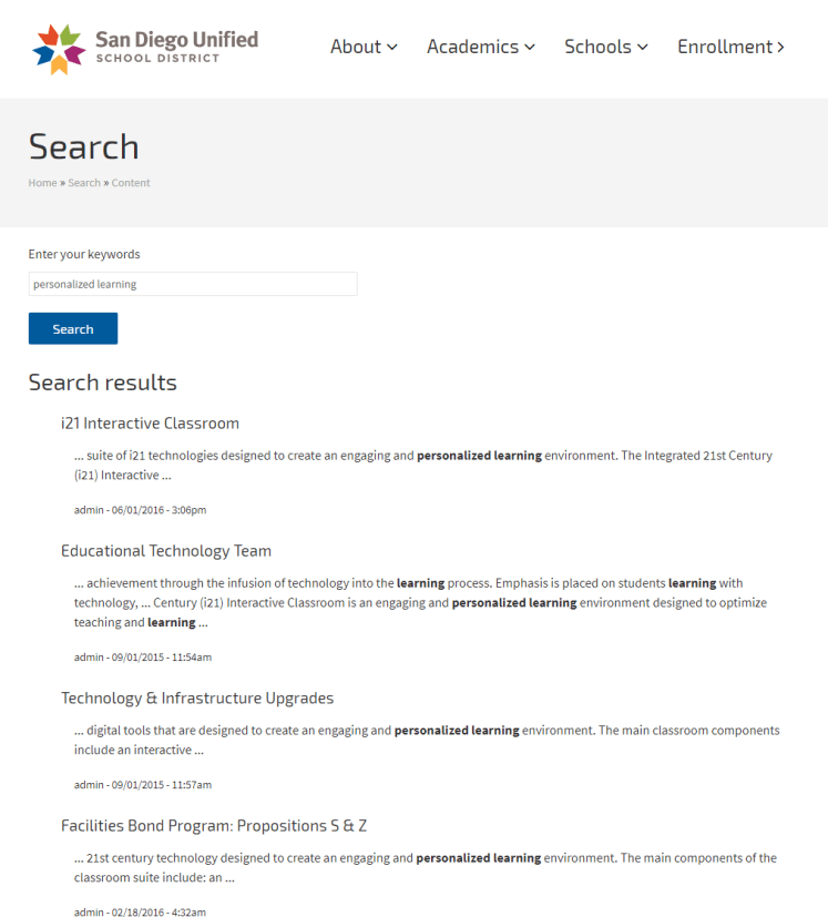 Most of what we hear about personalized learning in the San Diego Unified School District (SDUSD) does not feature the type described in the article but centers around some sort of technology. In fact when you search for “personalized learning” or “personalized learning environment” on the SDUSD website you turn up the same following 4 results: