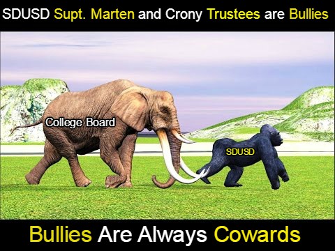 In filing a lawsuit against the College Board/ETS “15,000-Pound Elephant”, the overconfident, bloated, SDUSD 800-Pound Gorilla Bully ran into an opponent stronger, more powerful and more competent and exposed them as the incompetent cowards they are!