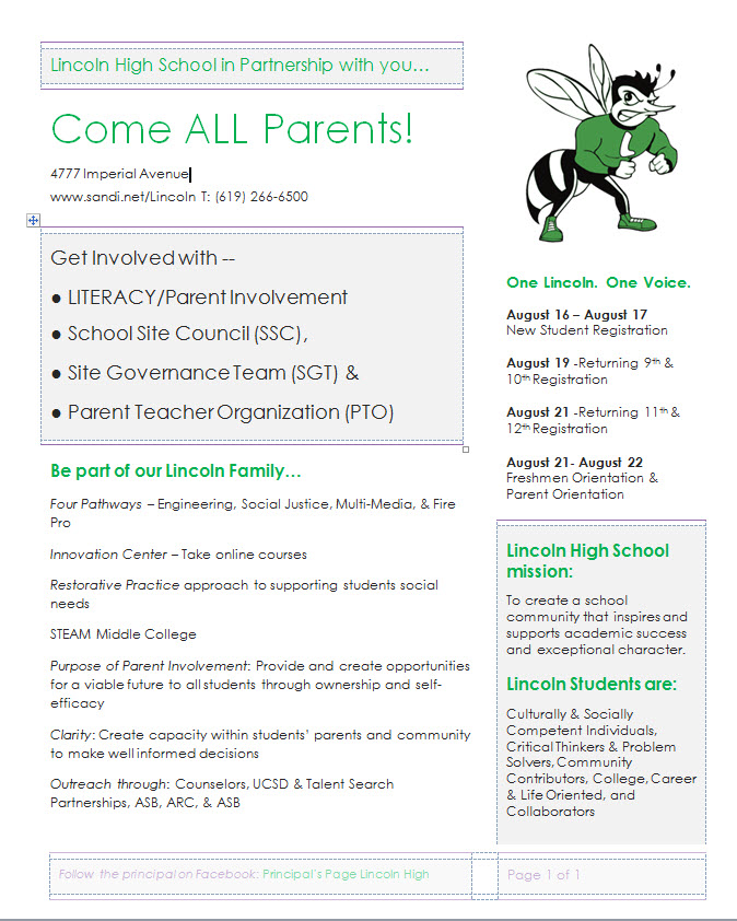 The flyer above highlights the enrollment schedule along with the outstanding Student educational programs and Parent involvement opportunities at Lincoln High School. Enrollment will be proceeding through Saturday.