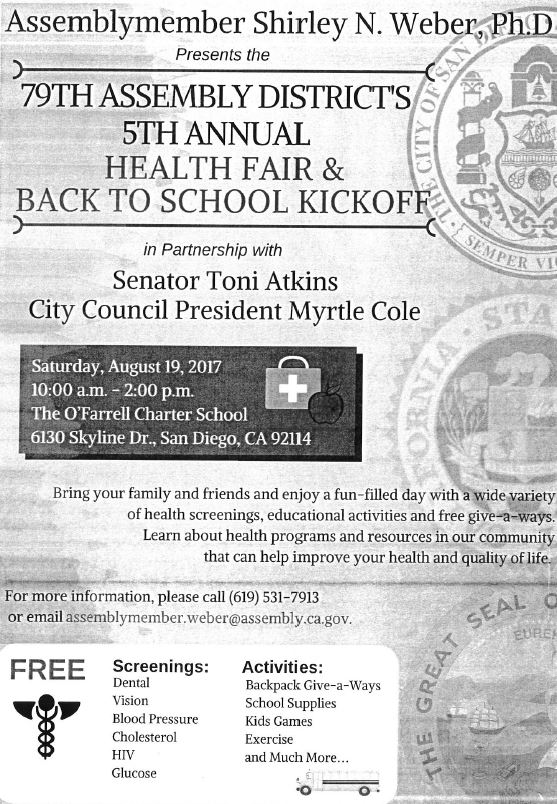 Just a few blocks away from Lincoln High School on Saturday is the second event, the 79th Assembly District’s 5th Annual Health Fair and Back to School Kickoff presented by Assemblymember Shirley Weber, Ph.D.