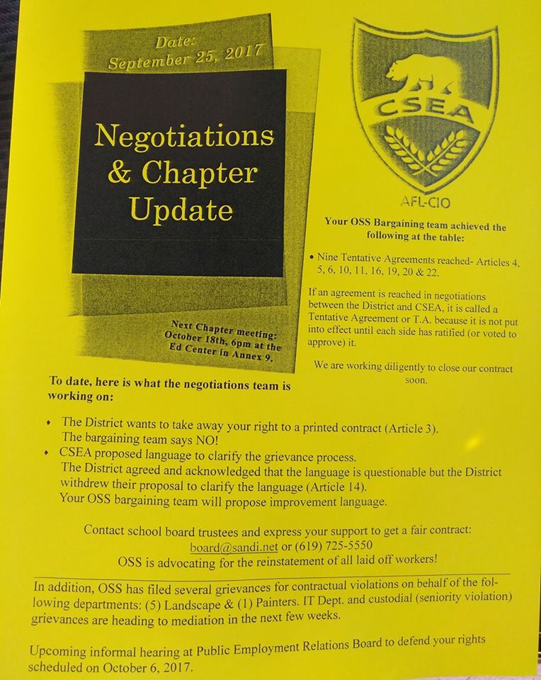 Both nighttime and daytime custodians, crew leaders, and daytime lead custodians (also known as BSS 1’s and 2’s) belong to a union called California School Employees Association (CSEA). They are members of the bargaining unit known as Operation Support Services (OSS) 724. They have a CSEA OSS 724 union contract that protects their rights: a contract that the District is presently violating DESPITE being under the watch of a School Board with a Board president, Richard Barrera, who has a history of being a labor organizer and is supposed to be pro-union!