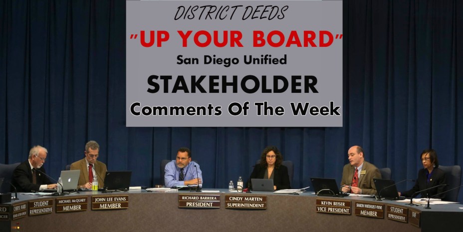 For our inaugural “UP YOUR BOARD” offering, District Deeds presents the following two comments from the March 6, 2018, San Diego Unified School District Board of Education Meeting: