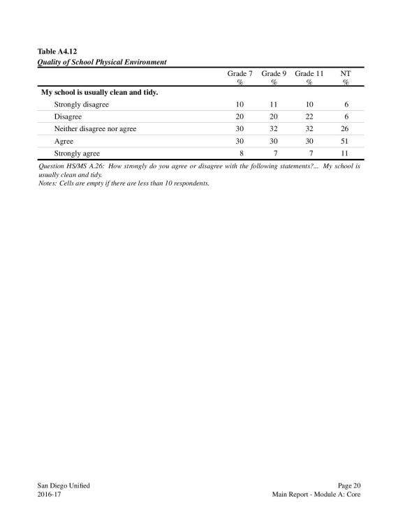 Another fact NOT included in the SDUSD report…Only 38% of secondary students answered “agree” or “strongly agree” to the question “My school is usually clean and tidy.”…and that was in 2017 BEFORE Marten and Richard “Tricky Dick” Barrera, Kevin “Dismissal with Prejudice” Beiser, John “You Can’t Handle the Truth” Evans, Michael “Foggy Bottom” McQuary and Sharon “Flying By The Seat of Our Pants” Payne laid off many of the Custodial, Landscaping and Food Service employees this year.