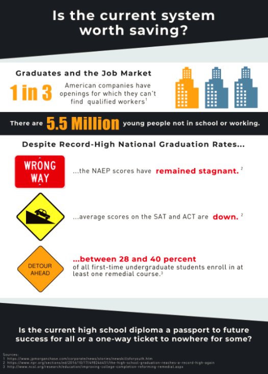 In turn, while the national graduation rate has soared to record highs from 2005 to 2015, the value of a high school diploma, as measured by median annual earnings, has taken a significant dip over that same time period. The value of the diploma has decreased, even as more students have crossed the stage. Would we say that 84.1 percent of our students, all those who graduated in 2016, are leaving high school prepared for successful lives? Ask ten people and we bet you won’t get a single “yes.” Therein lies the problem we are faced with today.