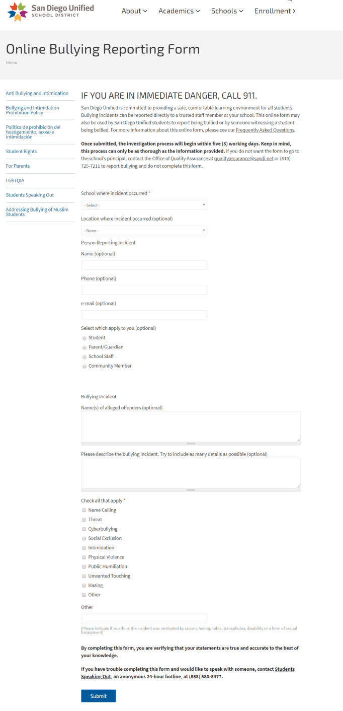 For instance, below is the SDUSD “Online Bullying Reporting Form” page: