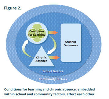 Chronic absence, which is typically defined as a student missing 10 percent or more of school for any reason, signifies that a student is missing so much school that they are academically at risk. In addition, the four school conditions for learning include physical and emotional health and safety; sense of belonging, connectedness, and support; academic challenge and engagement; and social and emotional competence for students and adults.