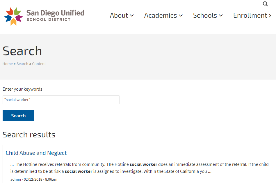 In the SDUSD website we only got one link that referred SDUSD Stakeholders to a Child Abuse and Neglect “hotline” social worker…nothing about SDUSD employees as Social Workers like the Chicago Public Schools.