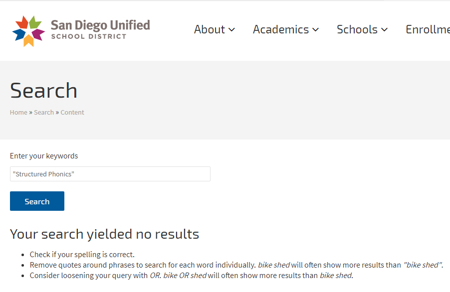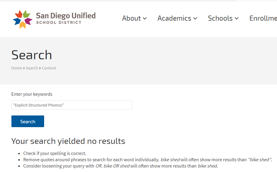 Since the new MMDS Superintendent hasn’t even started yet and ESS Marten (a supposed curriculum expert) has been around for over six years, the new MMDS “Explicit Structured Phonics” component MUST be part of the $1.3 Billion SDUSD education budget, so we searched the SDUSD Website for Marten’s Phonics plan: