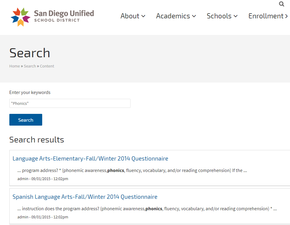 We only received 2 hits on “Phonics” on the SDUSD website, neither of them regarding a current curriculum, just a questionnaire in English and Spanish for a “review period through December 31, 2014”!!! NO phonics.