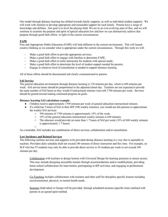“One important aspect of this process will be to document interactions, progress, and needs. Staff will maintain logs on student contact, note needs of each family, consider feedback, and reflect on what is working and what needs to be shifted. School staff will document contact with families in regard to distance learning plans which are not part of an IEP.”