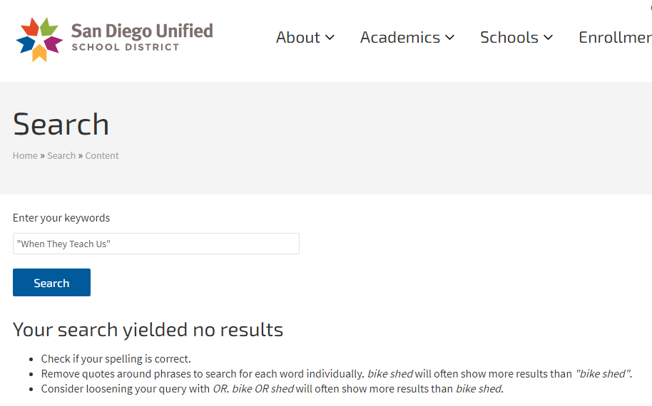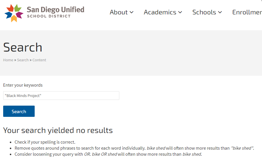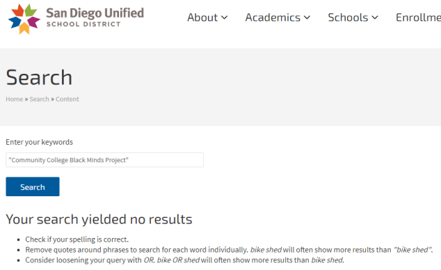 Even though Marten miscreants in the SDUSD propaganda machine were well aware of the study (based on do nothing quotes from the district in a KBPS article), absolutely NOTHING is available on the SDUSD website providing anything regarding CCEAL, Black Minds Project or the report titled “WHEN THEY TEACH US“.