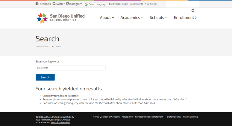 So today, June 21, 2020, just before publishing this post, we decided give them one last chance and search the SDUSD website one last time for the deserved acknowledgment of Juneteenth…