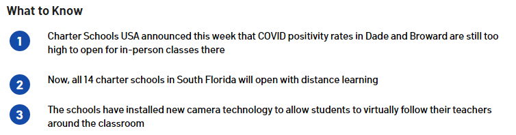 Charter Schools USA had initially said it would physically open its South Florida schools, but this week officials announced that in Broward and Miami-Dade Counties, the COVID positivity rates are still too high to reopen safely.