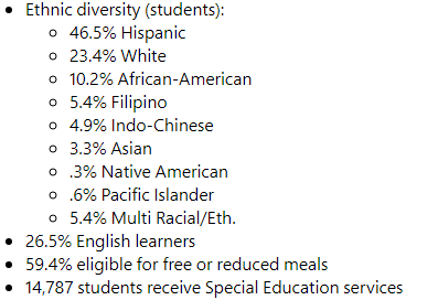 The Civil Rights Project at Harvard University conducted for TIME magazine named Sacramento “America’s Most Diverse City.”[7] Accordingly, SCUSD’s student population is reflected as 36% Hispanic or Latino, 18.3% Asian; 16.3% African American; and 19% white. About 7% of students are of two or more races. Residents within SCUSD speak more than 40 languages; 38% of students do not speak English at home.[1]