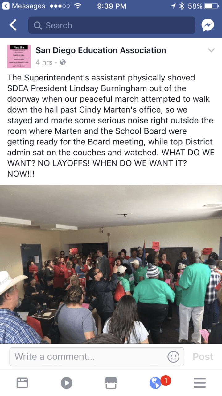 On top of it all, SDEA (Teachers Union) President Burningham claimed she was “pushed” by one of Supt. Cindy Marten’s henchmen during a protest earlier in the day outside the Board Meeting Closed Session…