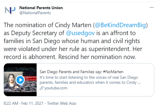 Here is the NPU video of San Diego Parents and Families speaking the truth about current San Diego Unified School District Superintendent Cindy Marten who has been nominated for United States Deputy Secretary of Education by the Biden Administration: