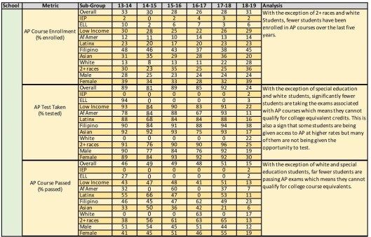 - There is a disproportionate level of achievement across subgroups in AP and CAASPP. Look at each of the schools by levels of poverty. The disparity between those who live above and below the poverty line is evident.