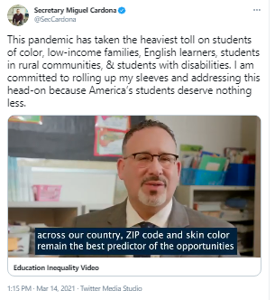 This advocacy for English Language Learner (ELL) Students and Students of color has continued throughout his impressive career. As recently as a week ago, March 14, 2021, he reinforced his belief in that support: