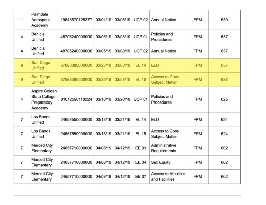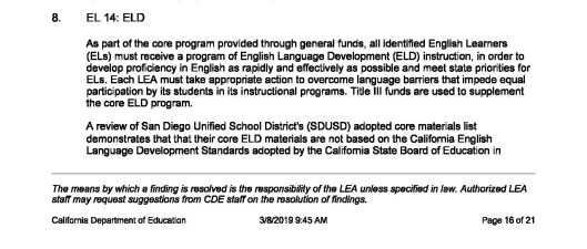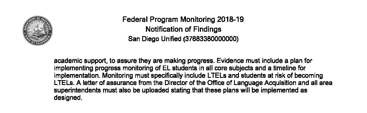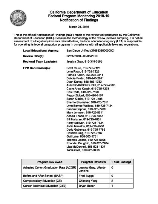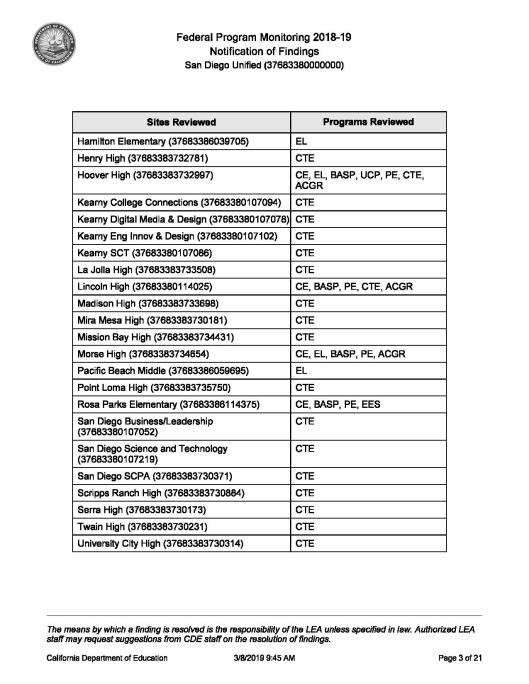 Here is the full report: California Department of Education Federal Program Monitoring Notification of Findings – San Diego Unified School District 2018/2019