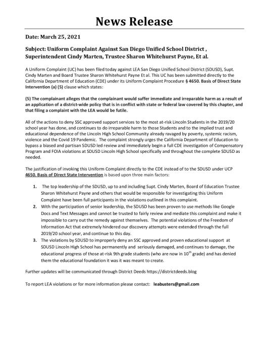 - Your family has been injured by the San Diego Unified School District, go to the District Deeds Complaint Forms page to find instructions to fight for your Civil Rights!