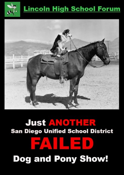 Having been to hundreds of SDUSD meetings over the last 15+ years, we realized that with local press cronies and the district propaganda team in attendance, there was a huge possibility that this supposed “Community Forum” was just a ruse. All signs pointed to it actually being an orchestrated SDUSD propaganda event. In other words, the REAL purpose of the event was NOT to hear from the Community about Lincoln.