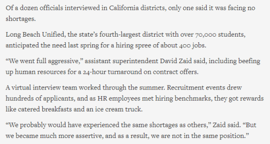 In fact another large California school district actually planned for the staffing shortage during the pandemic and now is serving all students with fully credentialed teachers.