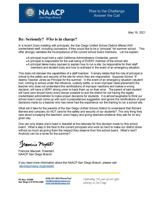 We thank Ms. Maxwell for her leadership and service to the SDUSD community and support each and every point she has made in her letter.