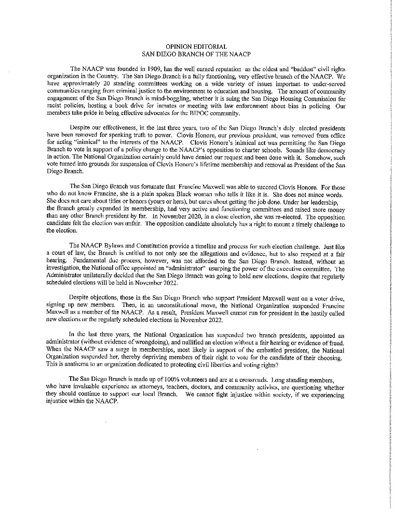 The following is the full San Diego Voice and Viewpoint NAACP- San Diego Branch OpEd: