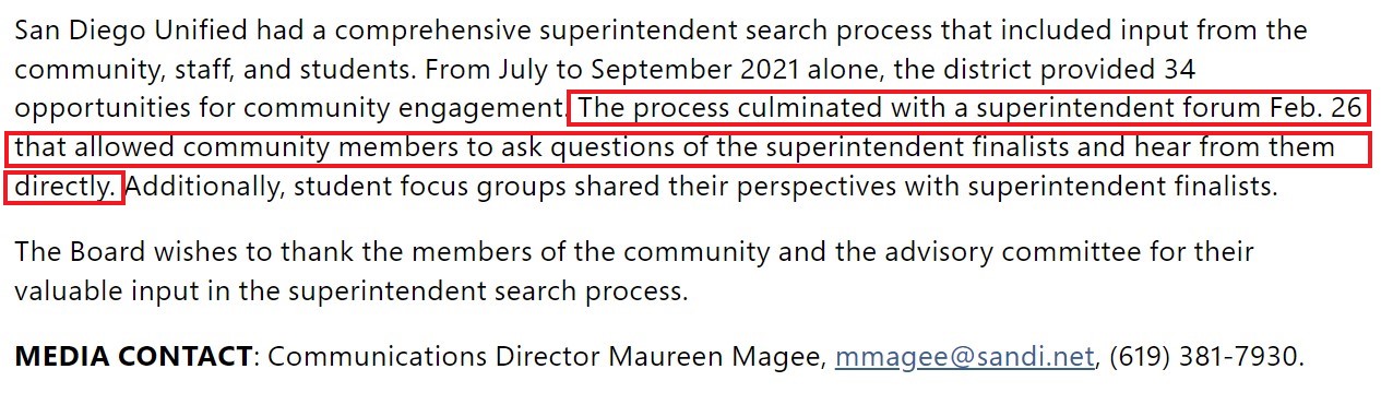 And how about, on March 7, 2022, the SDUSD propaganda department announcing the appointment of Lovey Dovey Lamont and covering it with a bald faced lie: