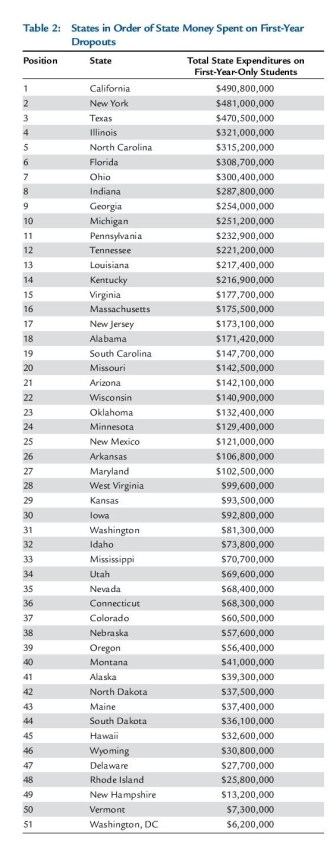 But We’re Number 1 according to Finishing the First Lap: The Cost of First-Year Student Attrition in America’s Four-Year Colleges and Universities