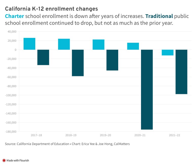 Our theory is that, as the California K-12 Enrollment Changes chart above illustrates, in the first full year of the pandemic (2020/21), familes were moving to Charter Schools as an emergency response partly for the reasons given (“weren’t enforcing mask mandates”) and other reasons (ongoing miserable SDUSD educational performance) the first year and then, after finding out how some charter schools were not up to the task, they chose the best schooling option possible for their kids. Those options included Private Schools and homeschooling, which caused the slight drop in Charter School enrollment in the current 2021/22 school year.