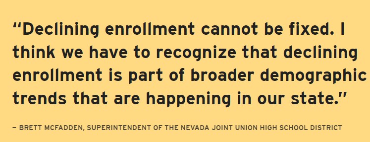 - “It’s tough to do exit interviews, but our takeaway is that people left because of jobs,” McFadden (superintendent of the Nevada Joint Union High School District) said. “Or they left because private schools weren’t enforcing mask mandates.”
