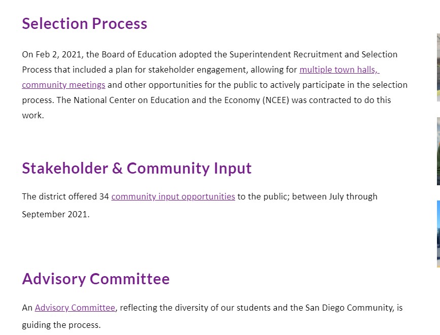 - “An Advisory Committee, reflecting the diversity of our students and the San Diego Community” that was hand-picked by the corrupt BOE Trustees and excluded anyone who might disagree with the pre-determined appointment of Jackson.