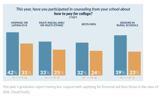 Some seniors also missed out on financial aid counseling. The survey shows that only a quarter of this year’s graduates said they received help on how to apply for assistance, compared with a third in 2019.