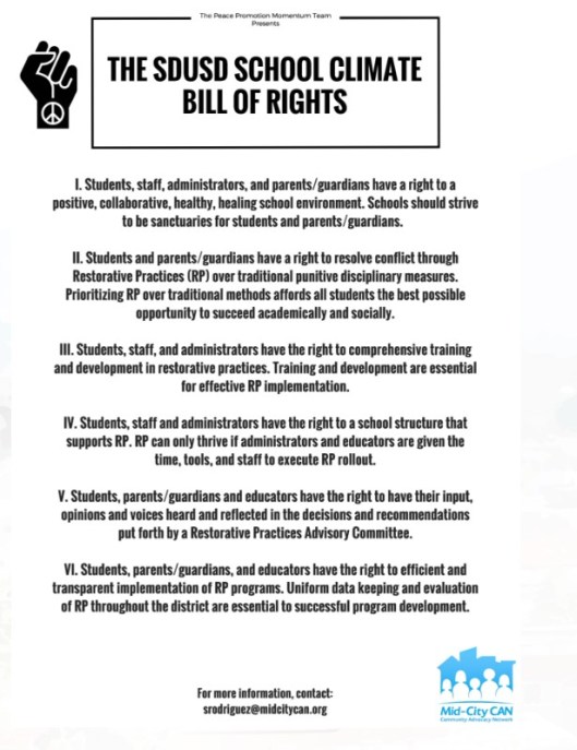 Or how about another bogus community propaganda vehicle called “The SDUSD School Climate Bill of Rights”. Here is an article from the Mid-City CAN website titled “School District Adopts School Climate Bill of Rights”