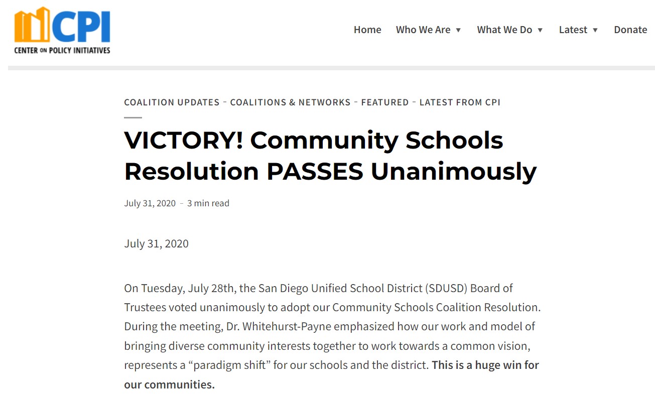 “the San Diego Unified School District (SDUSD) Board of Trustees voted unanimously to adopt our Community Schools Coalition Resolution”
