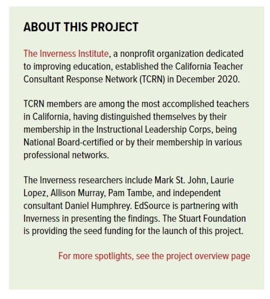 In 2021, The Inverness Institute’s Teacher Consultant Response Network members responded to two surveys about their experiences in the classroom during the COVID-19 pandemic. The Inverness Institute, in partnership with EdSource, published a series of spotlights portraying the different issues raised by accomplished teachers across California.