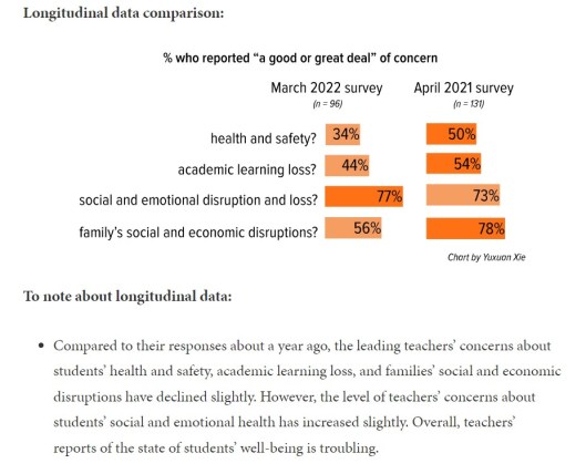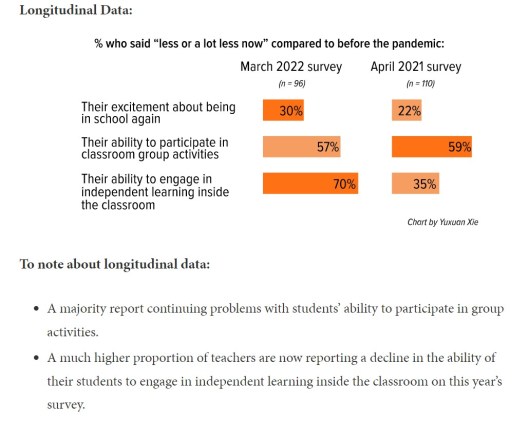 Leading teachers described their impressions of their students return to in-person instruction, and they have many and deep concerns about how their students are faring. Many teachers report that their students are not ready or able to participate constructively in or contribute to a positive classroom learning environment.