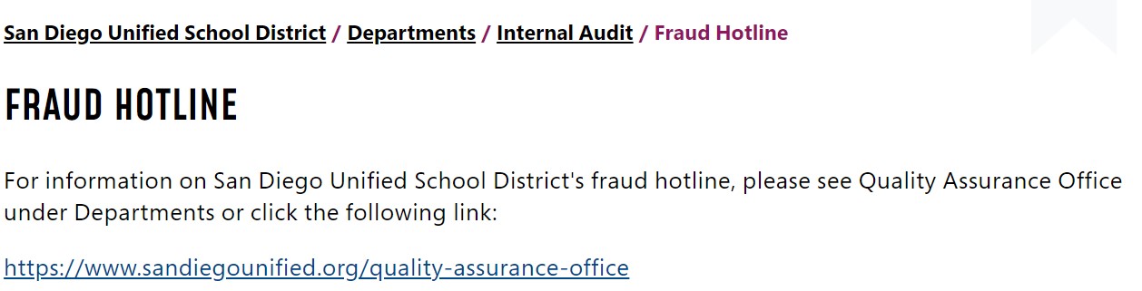 It also provides a so-called “Fraud Hotline” that is funneled to the SDUSD Legal Department via the corrupt, propaganda driven “Quality Assurance Department