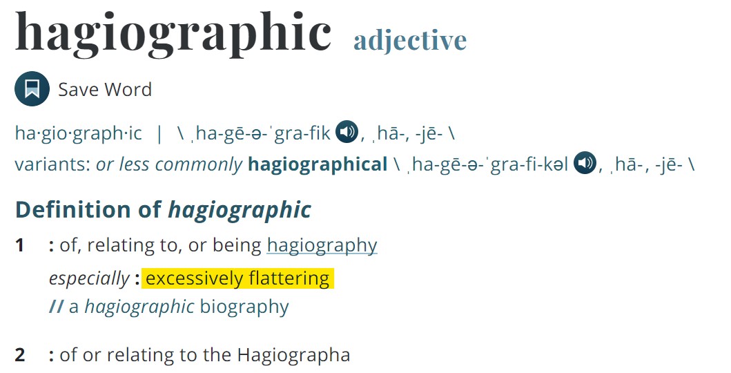 However the first thing we had to do was locate the definition of “hagiographic” in Merriam-Webster: