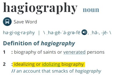 And here is the defintion of “hagiography” from Merriam-Webster: